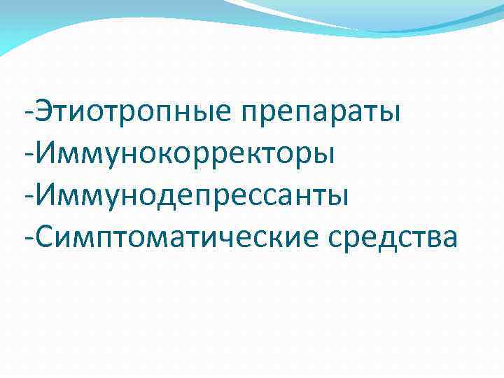 -Этиотропные препараты -Иммунокорректоры -Иммунодепрессанты -Симптоматические средства