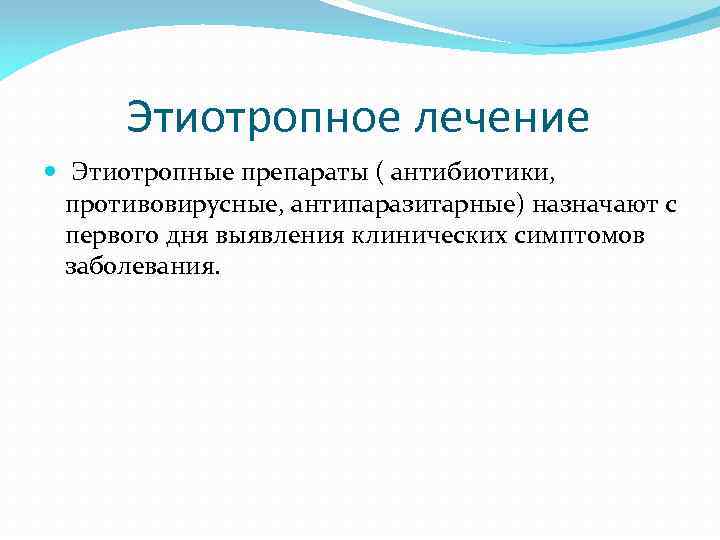 Этиотропное лечение Этиотропные препараты ( антибиотики, противовирусные, антипаразитарные) назначают с первого дня выявления клинических симптомов заболевания.