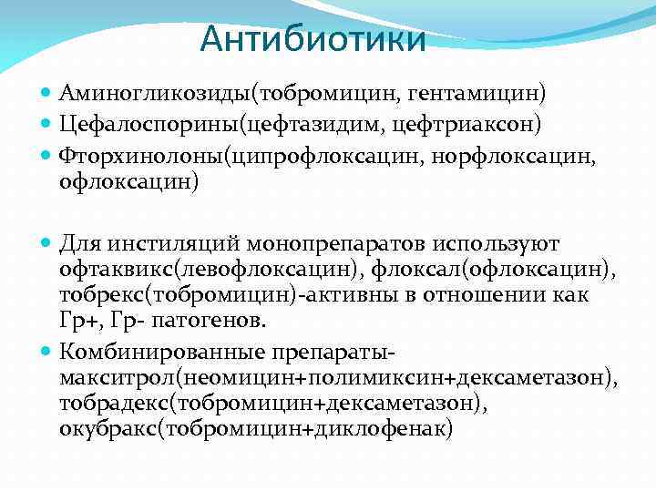 Антибиотики Аминогликозиды(тобромицин, гентамицин) Цефалоспорины(цефтазидим, цефтриаксон) Фторхинолоны(ципрофлоксацин, норфлоксацин, офлоксацин) Для инстиляций монопрепаратов используют офтаквикс(левофлоксацин), флоксал(офлоксацин), тобрекс(тобромицин)-активны в отношении как Гр+, Гр- патогенов. Комбинированные препаратымакситрол(неомицин+полимиксин+дексаметазон), тобрадекс(тобромицин+дексаметазон), окубракс(тобромицин+диклофенак)
