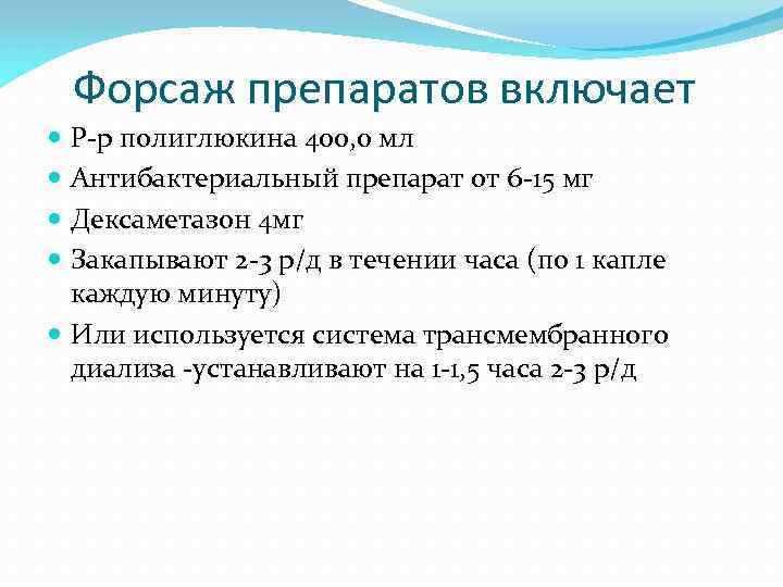 Форсаж препаратов включает Р-р полиглюкина 400, 0 мл Антибактериальный препарат от 6 -15 мг Дексаметазон 4 мг Закапывают 2 -3 р/д в течении часа (по 1 капле каждую минуту) Или используется система трансмембранного диализа -устанавливают на 1 -1, 5 часа 2 -3 р/д