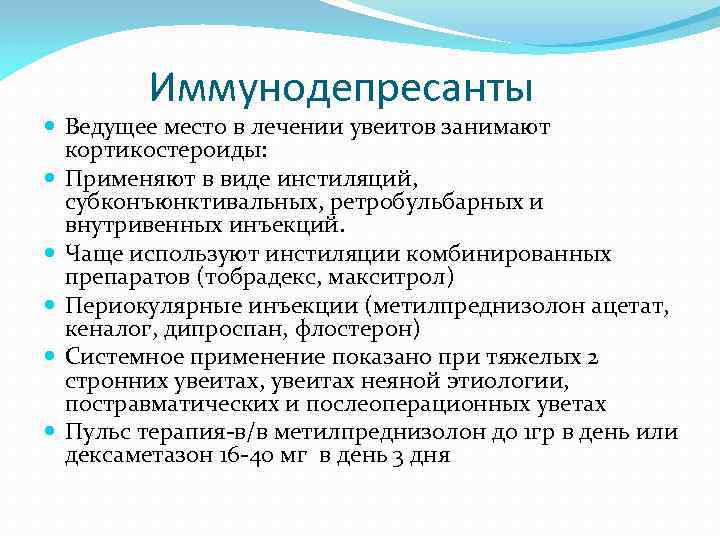 Иммунодепресанты Ведущее место в лечении увеитов занимают кортикостероиды: Применяют в виде инстиляций, субконъюнктивальных, ретробульбарных и внутривенных инъекций. Чаще используют инстиляции комбинированных препаратов (тобрадекс, макситрол) Периокулярные инъекции (метилпреднизолон ацетат, кеналог, дипроспан, флостерон) Системное применение показано при тяжелых 2 стронних увеитах, увеитах неяной этиологии, постравматических и послеоперационных уветах Пульс терапия-в/в метилпреднизолон до 1 гр в день или дексаметазон 16 -40 мг в день 3 дня