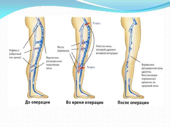 Основные виды операций, проводимых для лечения варикозного расширения вен нижних конечностей: Флебэктомия. Классическая операция, в процессе которой через разрезы в 3 -5 мм с помощью специальных зондов удаляется больная вена. Сначала варикозно-расширенная вена в месте ее впадения в глубокую вену перевязывается и пересекается (эта часть операции носит название кроссэктомия). Далее проводится удаление пораженной вены. Операция занимает 1 -2 часа, и, как правило, в условиях однодневного пребывания в стационаре, без длительной госпитализации пациента.