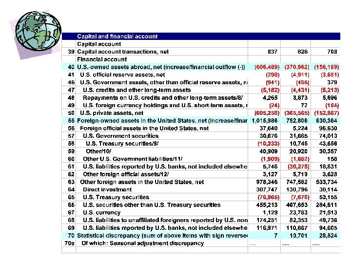 Capital Account n The capital and financial account is that balance of payments account in which all cross-border transactions involving financial assets are listed. This includes transactions between foreign and domestic residents, and foreign and domestic governments. n All purchases or sales of assets, including: n n n Direct investment Securities (debt) Bank claims and liabilities Official reserves transactions When U. S. citizens buy foreign securities or when foreigners buy U. S. securities, they are listed here as outflows and inflows, respectively.