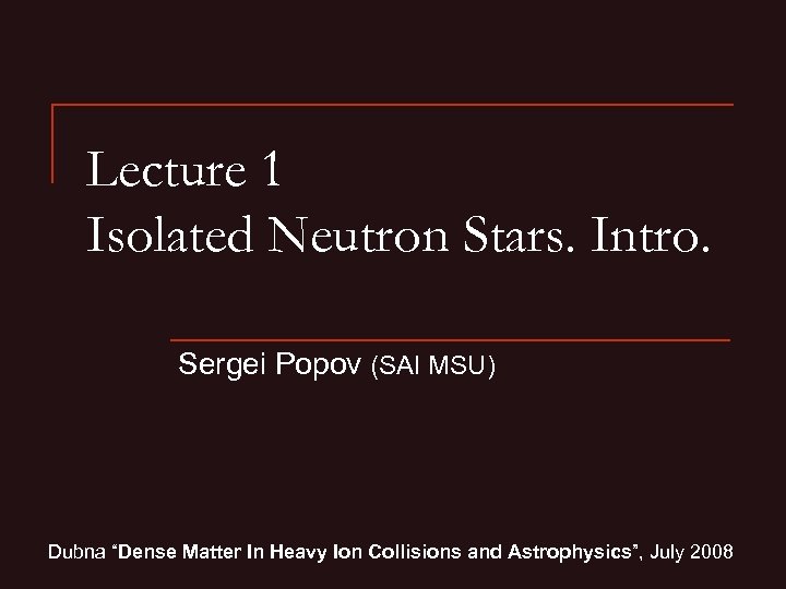 Lecture 1 Isolated Neutron Stars. Intro. Sergei Popov (SAI MSU) Dubna “Dense Matter In Heavy Ion Collisions and Astrophysics”, July 2008