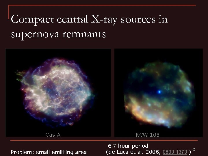 Compact central X-ray sources in supernova remnants Cas A Problem: small emitting area RCW 103 6. 7 hour period 10 (de Luca et al. 2006, 0803. 1373 )