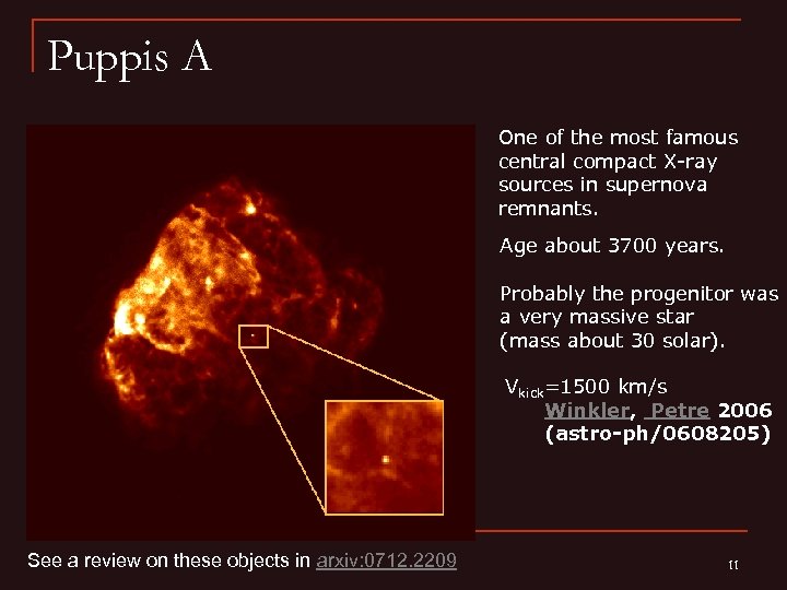 Puppis A One of the most famous central compact X-ray sources in supernova remnants. Age about 3700 years. Probably the progenitor was a very massive star (mass about 30 solar). Vkick=1500 km/s Winkler, Petre 2006 (astro-ph/0608205) See a review on these objects in arxiv: 0712. 2209 11