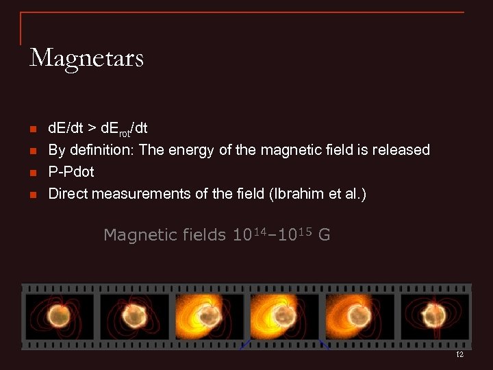 Magnetars n n d. E/dt > d. Erot/dt By definition: The energy of the magnetic field is released P-Pdot Direct measurements of the field (Ibrahim et al. ) Magnetic fields 1014– 1015 G 12