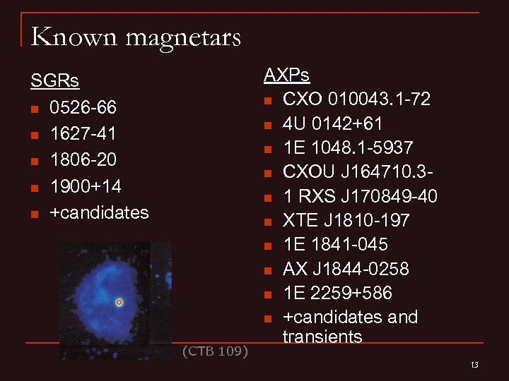 Known magnetars SGRs n 0526 -66 n 1627 -41 n 1806 -20 n 1900+14 n +candidates (СТВ 109) AXPs n CXO 010043. 1 -72 n 4 U 0142+61 n 1 E 1048. 1 -5937 n CXOU J 164710. 3 n 1 RXS J 170849 -40 n XTE J 1810 -197 n 1 E 1841 -045 n AX J 1844 -0258 n 1 E 2259+586 n +candidates and transients 13