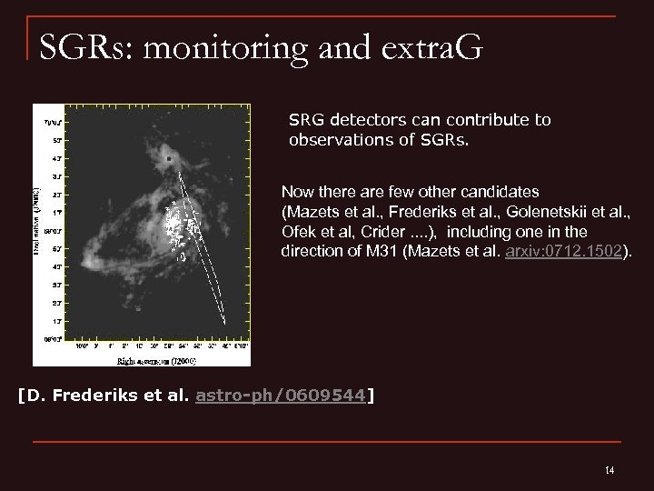 SGRs: monitoring and extra. G SRG detectors can contribute to observations of SGRs. Now there are few other candidates (Mazets et al. , Frederiks et al. , Golenetskii et al. , Ofek et al, Crider. . ), including one in the direction of M 31 (Mazets et al. arxiv: 0712. 1502). [D. Frederiks et al. astro-ph/0609544] 14