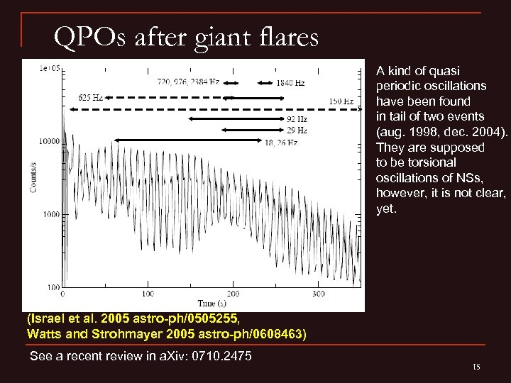 QPOs after giant flares A kind of quasi periodic oscillations have been found in tail of two events (aug. 1998, dec. 2004). They are supposed to be torsional oscillations of NSs, however, it is not clear, yet. (Israel et al. 2005 astro-ph/0505255, Watts and Strohmayer 2005 astro-ph/0608463) See a recent review in a. Xiv: 0710. 2475 15