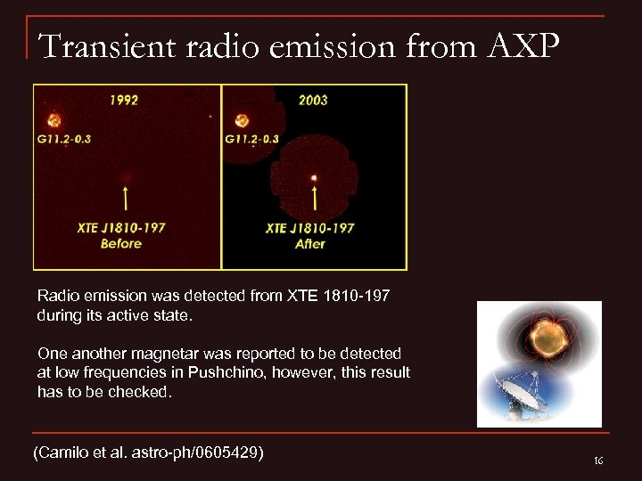 Transient radio emission from AXP Radio emission was detected from XTE 1810 -197 during its active state. One another magnetar was reported to be detected at low frequencies in Pushchino, however, this result has to be checked. (Camilo et al. astro-ph/0605429) 16