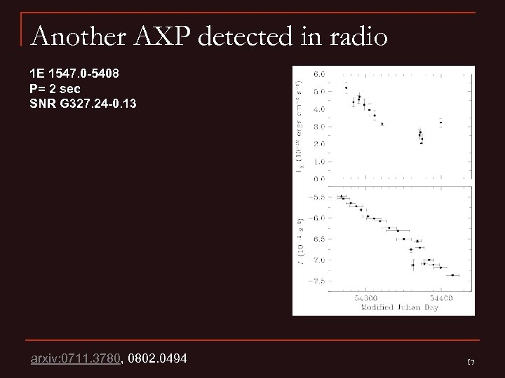Another AXP detected in radio 1 E 1547. 0 -5408 P= 2 sec SNR G 327. 24 -0. 13 arxiv: 0711. 3780, 0802. 0494 17
