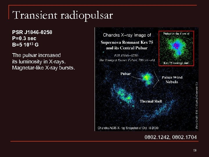 Transient radiopulsar PSR J 1846 -0258 P=0. 3 sec B=5 1013 G The pulsar increased its luminosity in X-rays. Magnetar-like X-ray bursts. 0802. 1242, 0802. 1704 18