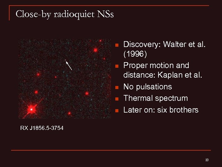 Close-by radioquiet NSs n n n Discovery: Walter et al. (1996) Proper motion and distance: Kaplan et al. No pulsations Thermal spectrum Later on: six brothers RX J 1856. 5 -3754 20
