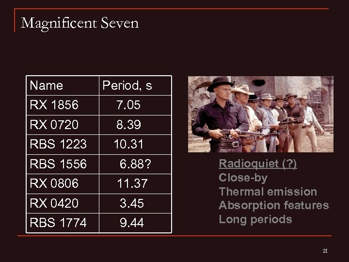 Magnificent Seven Name Period, s RX 1856 7. 05 RX 0720 8. 39 RBS 1223 10. 31 RBS 1556 6. 88? RX 0806 11. 37 RX 0420 3. 45 RBS 1774 9. 44 Radioquiet (? ) Close-by Thermal emission Absorption features Long periods 21