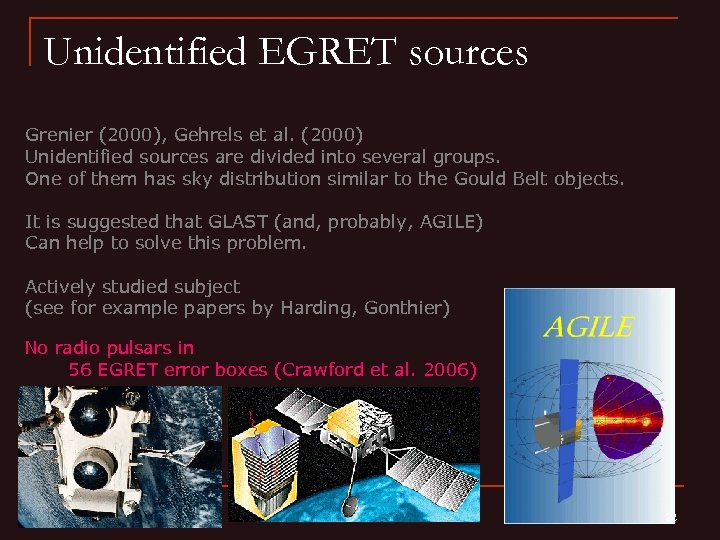 Unidentified EGRET sources Grenier (2000), Gehrels et al. (2000) Unidentified sources are divided into several groups. One of them has sky distribution similar to the Gould Belt objects. It is suggested that GLAST (and, probably, AGILE) Can help to solve this problem. Actively studied subject (see for example papers by Harding, Gonthier) No radio pulsars in 56 EGRET error boxes (Crawford et al. 2006) 22