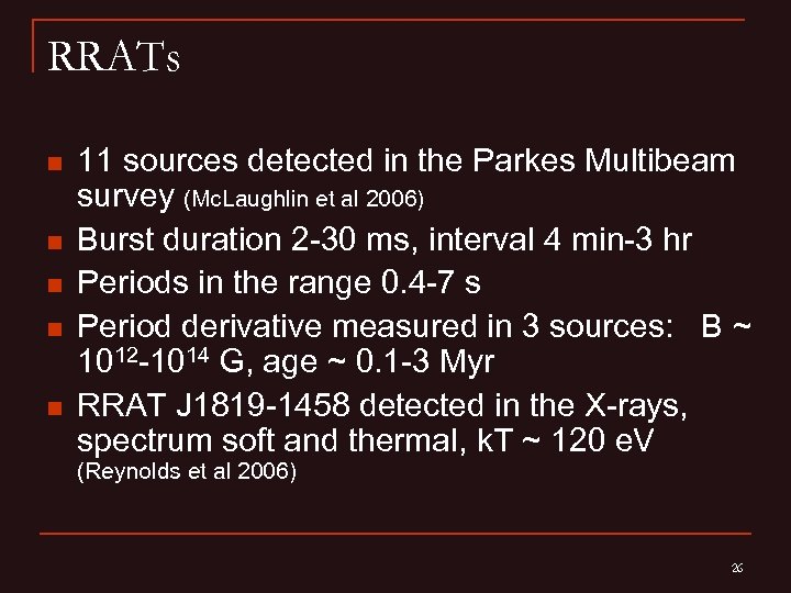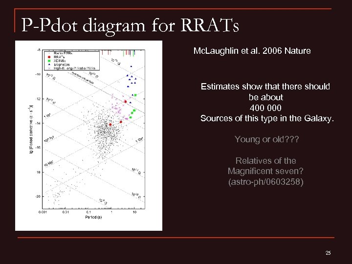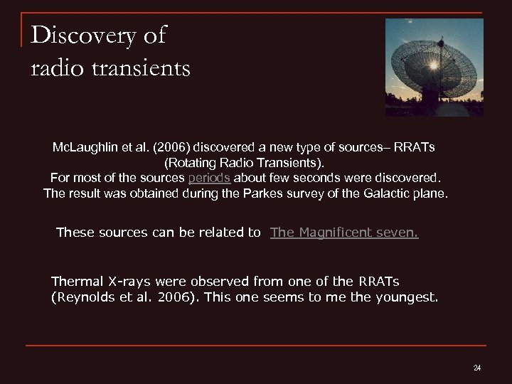 Discovery of radio transients Mc. Laughlin et al. (2006) discovered a new type of sources– RRATs (Rotating Radio Transients). For most of the sources periods about few seconds were discovered. The result was obtained during the Parkes survey of the Galactic plane. These sources can be related to The Magnificent seven. Thermal X-rays were observed from one of the RRATs (Reynolds et al. 2006). This one seems to me the youngest. 24