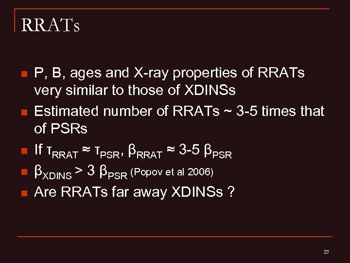 RRATs n n n 11 sources detected in the Parkes Multibeam survey (Mc. Laughlin et al 2006) Burst duration 2 -30 ms, interval 4 min-3 hr Periods in the range 0. 4 -7 s Period derivative measured in 3 sources: B ~ 1012 -1014 G, age ~ 0. 1 -3 Myr RRAT J 1819 -1458 detected in the X-rays, spectrum soft and thermal, k. T ~ 120 e. V (Reynolds et al 2006) 26