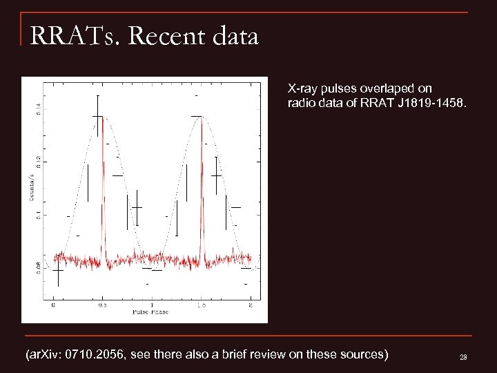 RRATs. Recent data X-ray pulses overlaped on radio data of RRAT J 1819 -1458. (ar. Xiv: 0710. 2056, see there also a brief review on these sources) 28
