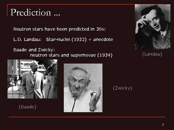 Prediction. . . Neutron stars have been predicted in 30 s: L. D. Landau: Star-nuclei (1932) + anecdote Baade and Zwicky: neutron stars and supernovae (1934) (Landau) (Zwicky) (Baade) 3
