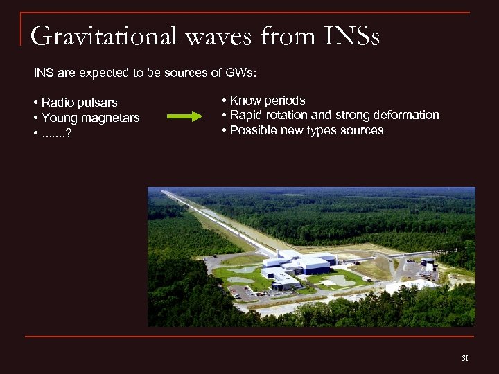Gravitational waves from INSs INS are expected to be sources of GWs: • Radio pulsars • Young magnetars • . . . . ? • Know periods • Rapid rotation and strong deformation • Possible new types sources 31