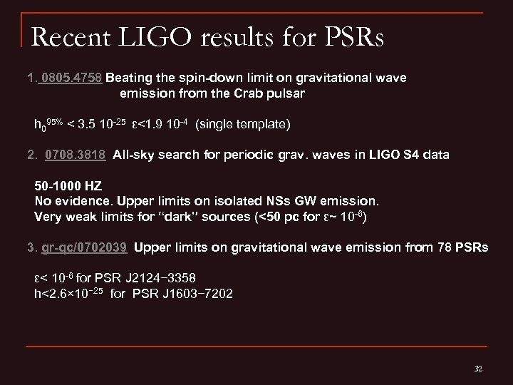 Recent LIGO results for PSRs 1. 0805. 4758 Beating the spin-down limit on gravitational wave emission from the Crab pulsar h 095% < 3. 5 10 -25 ε<1. 9 10 -4 (single template) 2. 0708. 3818 All-sky search for periodic grav. waves in LIGO S 4 data 50 -1000 HZ No evidence. Upper limits on isolated NSs GW emission. Very weak limits for “dark” sources (<50 pc for ε~ 10 -6) 3. gr-qc/0702039 Upper limits on gravitational wave emission from 78 PSRs ε< 10 -6 for PSR J 2124− 3358 h<2. 6× 10− 25 for PSR J 1603− 7202 32