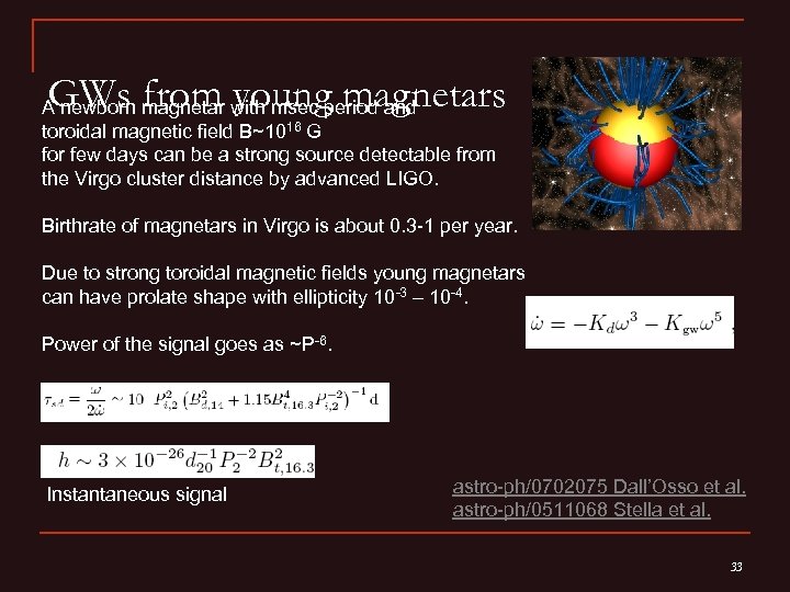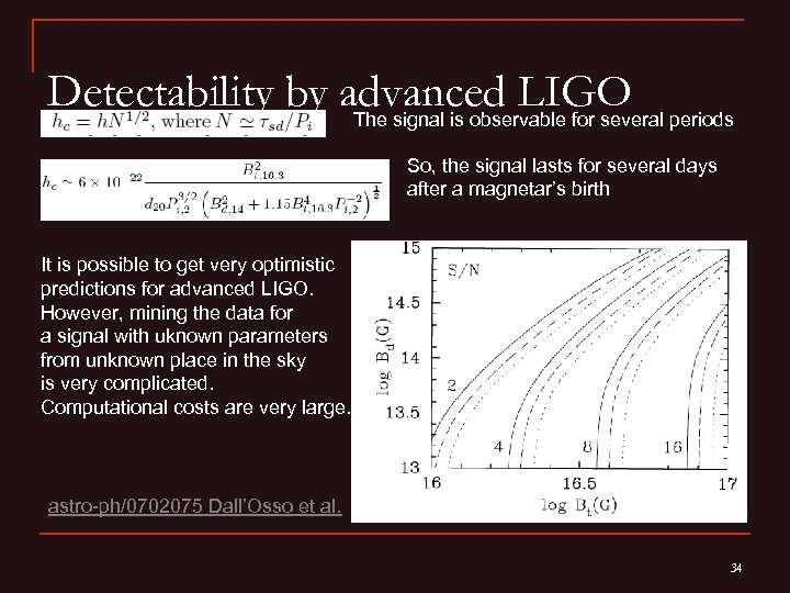 GWs from young magnetars A newborn magnetar with msec period and toroidal magnetic field B~1016 G for few days can be a strong source detectable from the Virgo cluster distance by advanced LIGO. Birthrate of magnetars in Virgo is about 0. 3 -1 per year. Due to strong toroidal magnetic fields young magnetars can have prolate shape with ellipticity 10 -3 – 10 -4. Power of the signal goes as ~P-6. Instantaneous signal astro-ph/0702075 Dall’Osso et al. astro-ph/0511068 Stella et al. 33