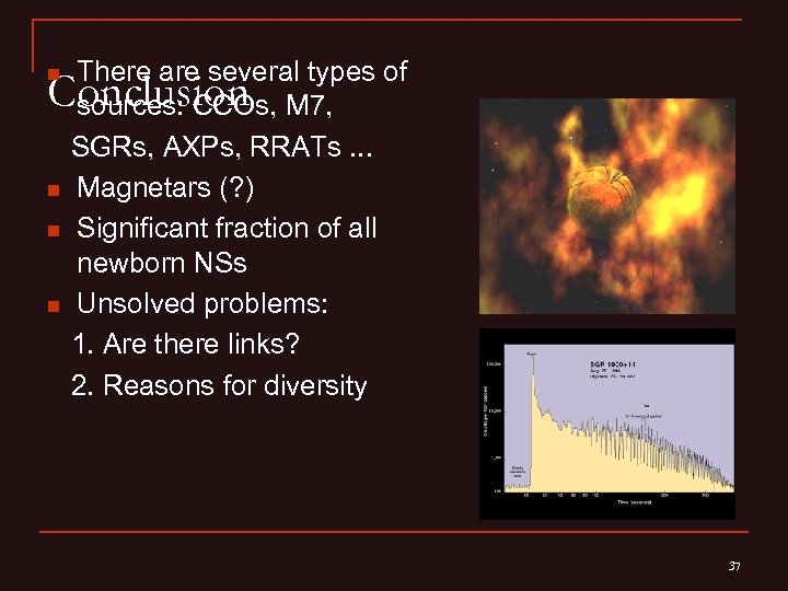 n There are several types of sources: CCOs, M 7, SGRs, AXPs, RRATs. . . Magnetars (? ) Significant fraction of all newborn NSs Unsolved problems: 1. Are there links? 2. Reasons for diversity Conclusion n 37