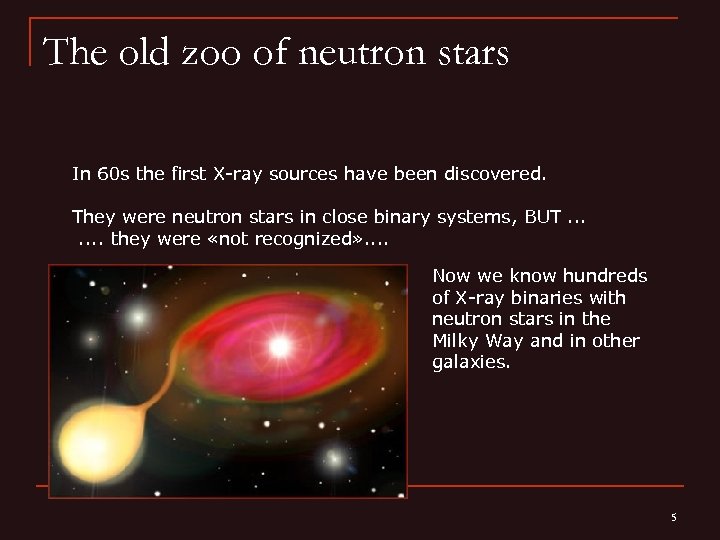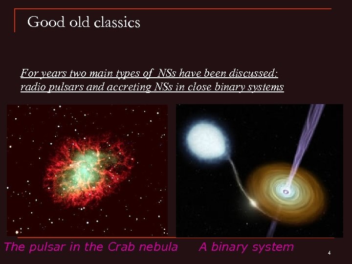 Good old classics For years two main types of NSs have been discussed: radio pulsars and accreting NSs in close binary systems The pulsar in the Crab nebula A binary system 4