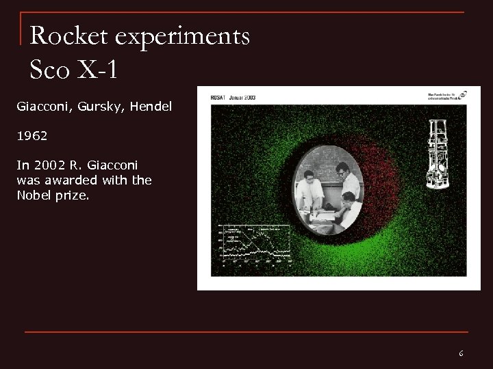Rocket experiments Sco X-1 Giacconi, Gursky, Hendel 1962 In 2002 R. Giacconi was awarded with the Nobel prize. 6