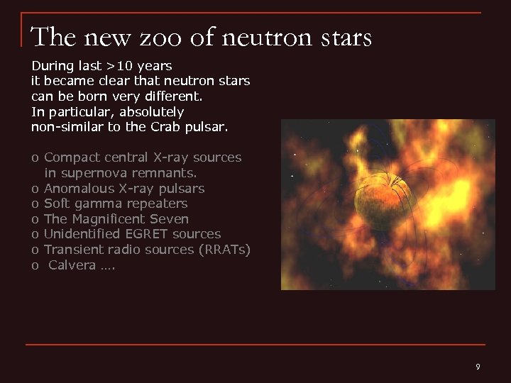 Main reviews • NS basics: physics/0503245 astro-ph/0405262 • SGRs & AXPs: astro-ph/0406133 • CCOs: astro-ph/0311526 0712. 2209 • Quark stars: astro-ph/0608360 • The Magnificent Seven: astro-ph/0502457 astro-ph/0609066 0801. 1143 • RRATs: astro-ph/0511587 • Cooling of NSs: astro-ph/0508056 astro-ph/0402143 • NS structure astro-ph/0608360 • NS interiors ar. Xiv: 0705. 2708 • Magnetic field of NSs ar. Xiv: 0802. 2227 0711. 3650 • Eo. S astro-ph/0612440 • NS atmospheres astro-ph/0206025 38