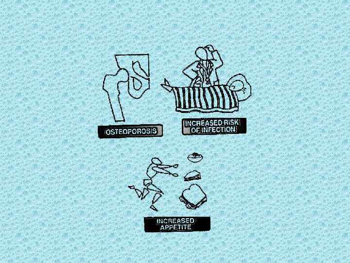 Adverse effects of GCs: • • • osteoporosis peptic ulceration glucosuria (hyperglycemia) increased risk of infection increased appetite hypertension edema euphoria psychoses