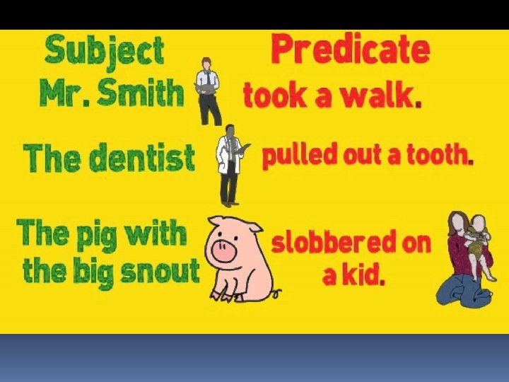 Subject and Predicate The Subject is the person/place/thing/animal about which something is said. The Predicate is what is said about the subject. Examples------