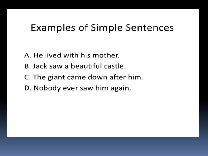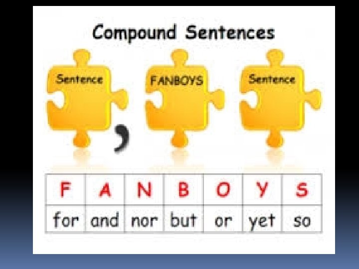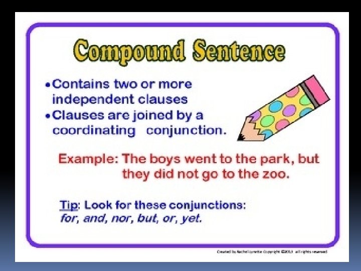 ANSWERS 1. We rang the doorbell, but no one answered it. compound 2. I wrote Jane a letter while she was away at camp. complex 3. Have you seen Mr. Nelson’s garden at the back of his house? simple 4. When Miss Jones entered the room, we all became quiet. complex 5. Susan likes chemistry, but she likes physics better. compound 6. Since we’ve lost every game but one, no one is excited about football this year. complex 7. When I’m tired , I’m not good company for anyone. complex 8. Wandering aimlessly up the path, Mr. Cutter approached the house. simple 9. Susan sang a solo and accompanied herself on the piano. Simple 10. When the rain began, we were playing tennis. complex