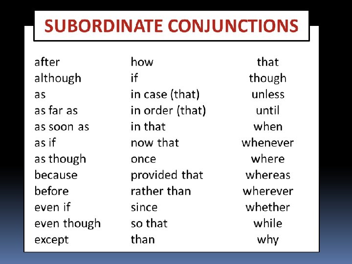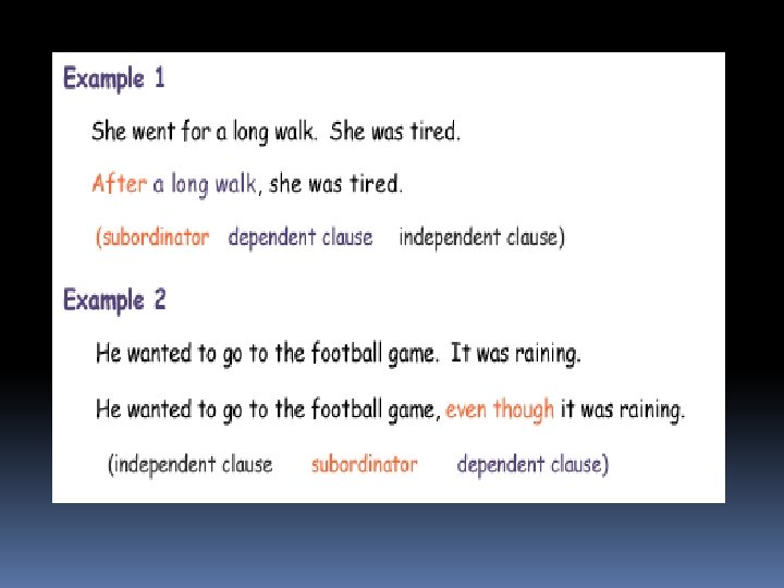 DEPENDENT CLAUSE Dependent clauses have a subject doing a verb, but they have a subordinate conjunction placed in front of the clause. That subordinate conjunction means that the clause can't stand independently by itself and become a complete sentence. Here are some examples of dependent clauses: since she laughs at diffident men when the saints go marching in because she smiled at him