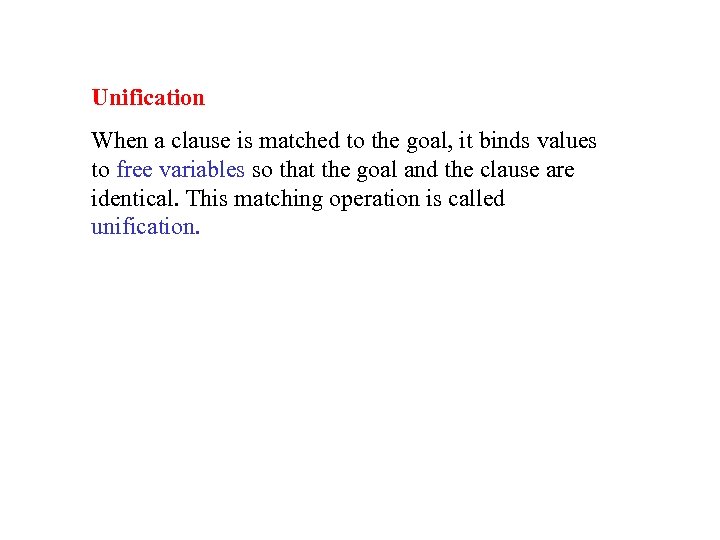 Unification When a clause is matched to the goal, it binds values to free variables so that the goal and the clause are identical. This matching operation is called unification.