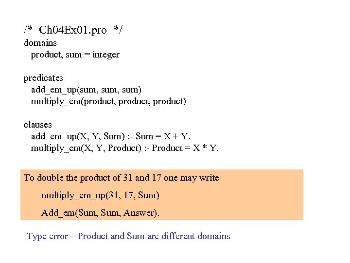 /* Ch 04 Ex 01. pro */ domains product, sum = integer predicates add_em_up(sum, sum) multiply_em(product, product) clauses add_em_up(X, Y, Sum) : - Sum = X + Y. multiply_em(X, Y, Product) : - Product = X * Y. To double the product of 31 and 17 one may write multiply_em_up(31, 17, Sum) Add_em(Sum, Answer). Type error – Product and Sum are different domains