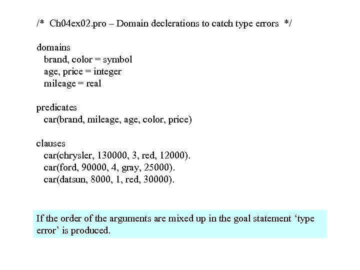 /* Ch 04 ex 02. pro – Domain declerations to catch type errors */ domains brand, color = symbol age, price = integer mileage = real predicates car(brand, mileage, color, price) clauses car(chrysler, 130000, 3, red, 12000). car(ford, 90000, 4, gray, 25000). car(datsun, 8000, 1, red, 30000). If the order of the arguments are mixed up in the goal statement ‘type error’ is produced.