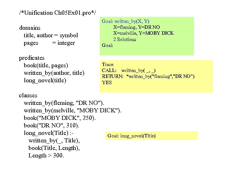 /*Unification Ch 05 Ex 01. pro*/ domains title, author = symbol pages = integer Goal: written_by(X, Y) X=fleming, Y=DR NO X=melville, Y=MOBY DICK 2 Solutions Goal: predicates book(title, pages) written_by(author, title) long_novel(title) Trace CALL: written_by( _, _) RETURN: *written_by("fleming", "DR NO”) YES clauses written_by(fleming, "DR NO"). written_by(melville, "MOBY DICK"). book("MOBY DICK", 250). book("DR NO", 310). long_novel(Title) : Goal: long_novel(Title) written_by(_, Title), book(Title, Length), Length > 300.