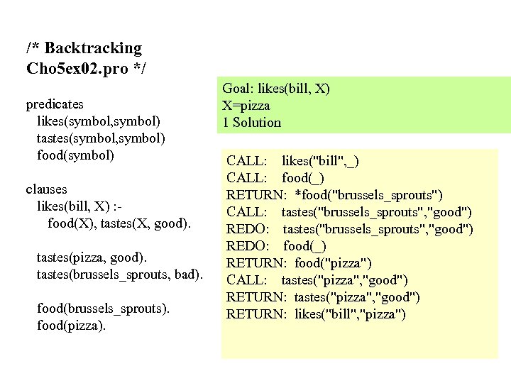 /* Backtracking Cho 5 ex 02. pro */ predicates likes(symbol, symbol) tastes(symbol, symbol) food(symbol) clauses likes(bill, X) : food(X), tastes(X, good). tastes(pizza, good). tastes(brussels_sprouts, bad). food(brussels_sprouts). food(pizza). Goal: likes(bill, X) X=pizza 1 Solution CALL: likes("bill", _) CALL: food(_) RETURN: *food("brussels_sprouts") CALL: tastes("brussels_sprouts", "good") REDO: food(_) RETURN: food("pizza") CALL: tastes("pizza", "good") RETURN: likes("bill", "pizza")