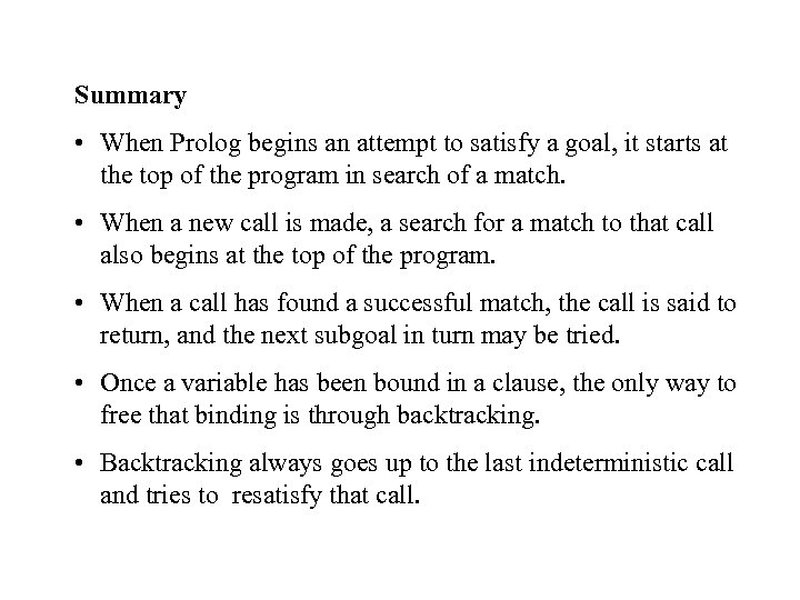 Summary • When Prolog begins an attempt to satisfy a goal, it starts at the top of the program in search of a match. • When a new call is made, a search for a match to that call also begins at the top of the program. • When a call has found a successful match, the call is said to return, and the next subgoal in turn may be tried. • Once a variable has been bound in a clause, the only way to free that binding is through backtracking. • Backtracking always goes up to the last indeterministic call and tries to resatisfy that call.