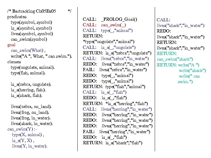 /* Bactracking Ch 05 Ex 05 */ predicates type(symbol, symbol) is_a(symbol, symbol) lives(symbol, symbol) can_swim(symbol) goal can_swim(What) , write("A ", What, " can swim. "). clauses type(ungulate, animal). type(fish, animal). is_a(zebra, ungulate). is_a(herring, fish). is_a(shark, fish). lives(zebra, on_land). lives(frog, in_water). lives(shark, in_water). can_swim(Y) : type(X, animal) , is_a(Y, X) , lives(Y, in_water). CALL: _PROLOG_Goal() CALL: can_swim(_) CALL: type(_, "animal") RETURN: *type("ungulate", "animal") CALL: is_a(_, "ungulate") RETURN: is_a("zebra", "ungulate") CALL: lives("zebra", "in_water") REDO: lives("zebra", "in_water") FAIL: lives("zebra", "in_water") REDO: type(_, "animal") RETURN: type("fish", "animal") CALL: is_a(_, "fish") REDO: is_a(_, "fish") RETURN: *is_a("herring", "fish") CALL: lives("herring", "in_water") REDO: lives("herring", "in_water") FAIL: lives("herring", "in_water") REDO: is_a(_, "fish") RETURN: is_a("shark", "fish") CALL: lives("shark", "in_water") REDO: lives("shark", "in_water") RETURN: can_swim("shark") RETURN: write("A ") write("shark") write(" can swim. ")