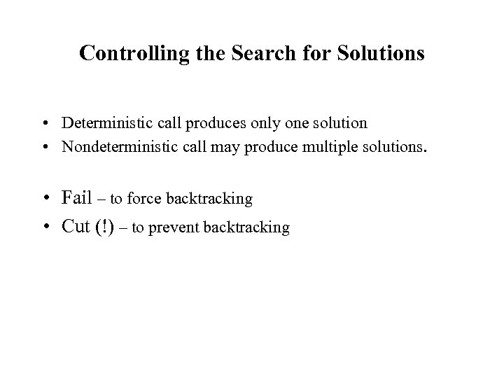 Controlling the Search for Solutions • Deterministic call produces only one solution • Nondeterministic call may produce multiple solutions. • Fail – to force backtracking • Cut (!) – to prevent backtracking
