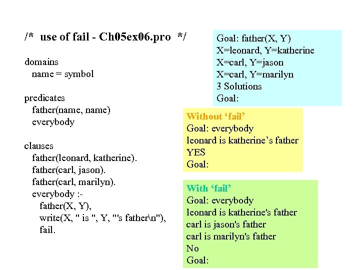 /* use of fail - Ch 05 ex 06. pro */ domains name = symbol predicates father(name, name) everybody clauses father(leonard, katherine). father(carl, jason). father(carl, marilyn). everybody : father(X, Y), write(X, " is ", Y, "'s fathern"), fail. Goal: father(X, Y) X=leonard, Y=katherine X=carl, Y=jason X=carl, Y=marilyn 3 Solutions Goal: Without ‘fail’ Goal: everybody leonard is katherine’s father YES Goal: With ‘fail’ Goal: everybody leonard is katherine's father carl is jason's father carl is marilyn's father No Goal: