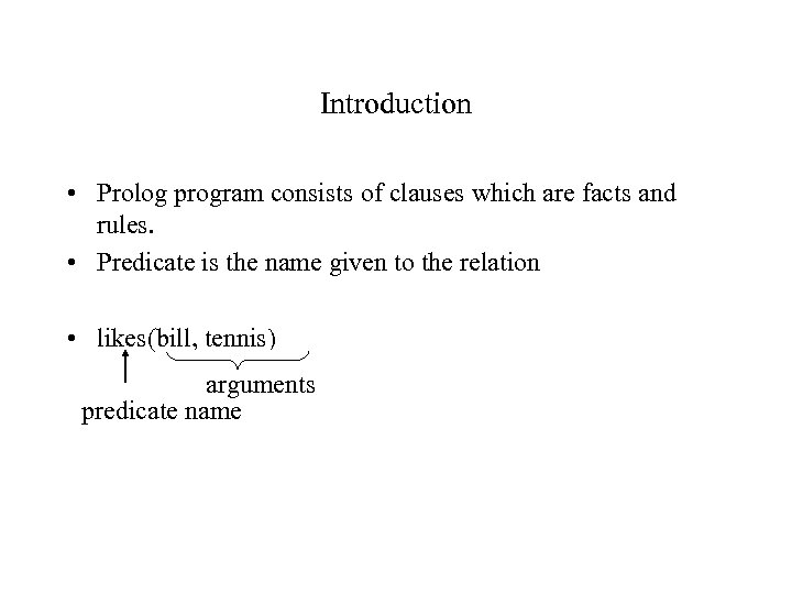 Introduction • Prolog program consists of clauses which are facts and rules. • Predicate is the name given to the relation • likes(bill, tennis) arguments predicate name