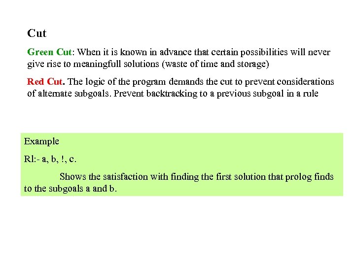 Cut Green Cut: When it is known in advance that certain possibilities will never give rise to meaningfull solutions (waste of time and storage) Red Cut. The logic of the program demands the cut to prevent considerations of alternate subgoals. Prevent backtracking to a previous subgoal in a rule Example Rl: - a, b, !, c. Shows the satisfaction with finding the first solution that prolog finds to the subgoals a and b.