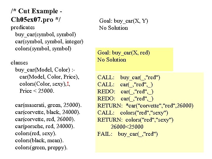 /* Cut Example Ch 05 ex 07. pro */ predicates buy_car(symbol, symbol) car(symbol, integer) colors(symbol, symbol) clauses buy_car(Model, Color) : car(Model, Color, Price), colors(Color, sexy), !, Price < 25000. car(maserati, green, 25000). car(corvette, black, 24000). car(corvette, red, 26000). car(porsche, red, 24000). colors(red, sexy). colors(black, mean). colors(green, preppy). Goal: buy_car(X, Y) No Solution Goal: buy_car(X, red) No Solution CALL: buy_car(_, "red") CALL: car(_, "red", _) REDO: car(_, "red", _) RETURN: *car("corvette", "red", 26000) CALL: colors("red", "sexy") RETURN: colors("red", "sexy") 26000<25000 FAIL: buy_car(_, "red")