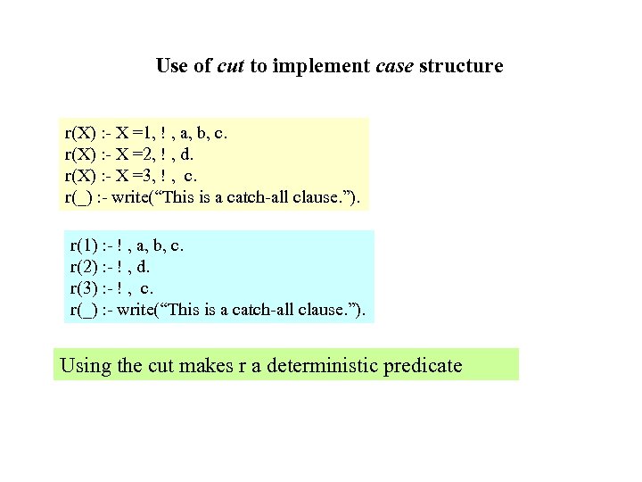 Use of cut to implement case structure r(X) : - X =1, ! , a, b, c. r(X) : - X =2, ! , d. r(X) : - X =3, ! , c. r(_) : - write(“This is a catch-all clause. ”). r(1) : - ! , a, b, c. r(2) : - ! , d. r(3) : - ! , c. r(_) : - write(“This is a catch-all clause. ”). Using the cut makes r a deterministic predicate