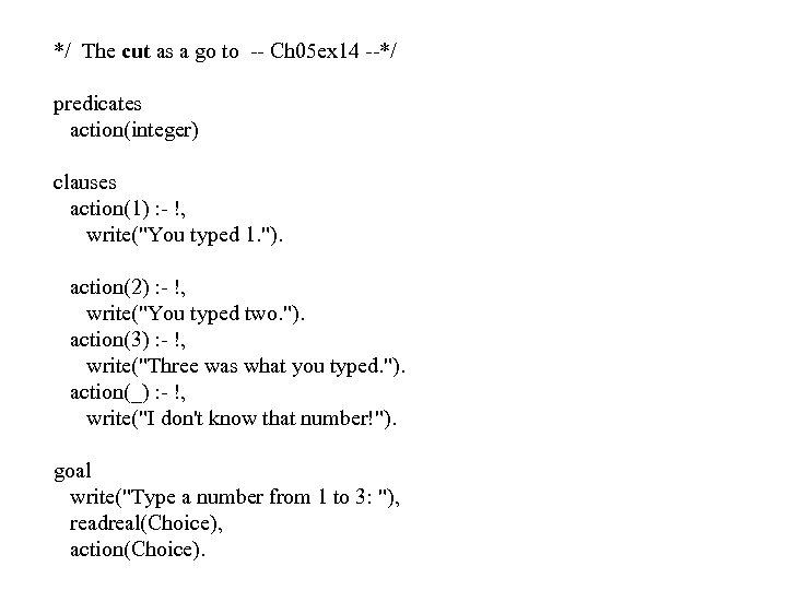 */ The cut as a go to -- Ch 05 ex 14 --*/ predicates action(integer) clauses action(1) : - !, write("You typed 1. "). action(2) : - !, write("You typed two. "). action(3) : - !, write("Three was what you typed. "). action(_) : - !, write("I don't know that number!"). goal write("Type a number from 1 to 3: "), readreal(Choice), action(Choice).