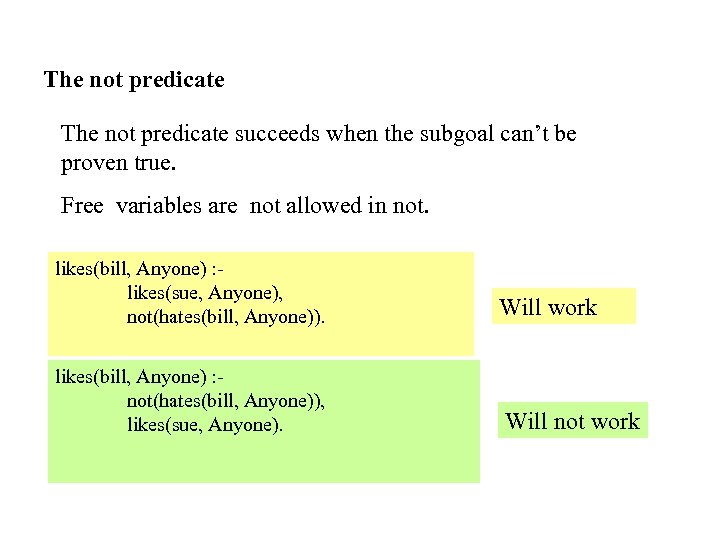The not predicate succeeds when the subgoal can’t be proven true. Free variables are not allowed in not. likes(bill, Anyone) : likes(sue, Anyone), not(hates(bill, Anyone)). Will work likes(bill, Anyone) : not(hates(bill, Anyone)), likes(sue, Anyone). Will not work